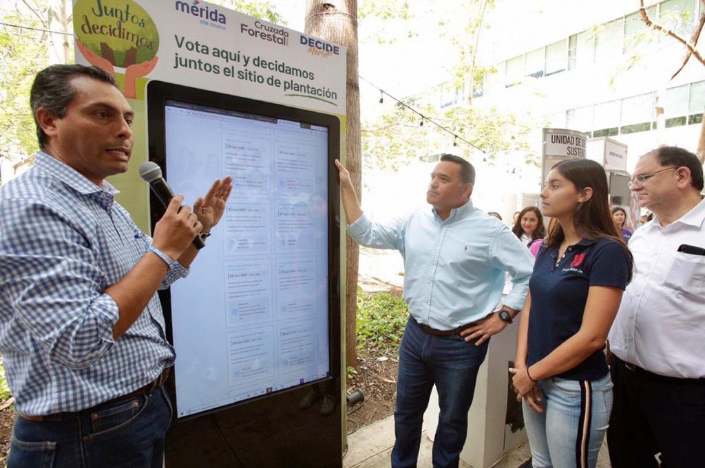 Indicó que, ante la contingencia sanitaria por el coronavirus, las votaciones que se habían previsto realizar en módulos fijos y temporales en universidades, puntos verdes, y demás espacios, se redujeron únicamente a la plataforma: https://decide.merida.gob.mx/CruzadaForestal2020.