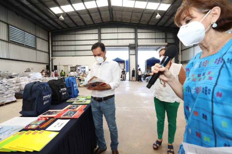 Vila Dosal realizó el banderazo de salida de los primeros camiones que llevan esos artículos y libros de texto gratuitos en beneficio de estudiantes de escuelas públicas de primaria y secundaria de todo el estado, toda vez que el ciclo escolar en Yucatán comenzará en la modalidad a distancia el lunes 24 de agosto.