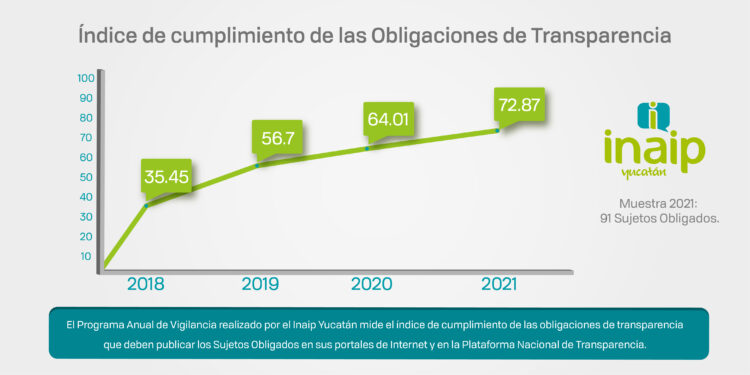 Tras la culminación del Programa Anual de Vigilancia 2021 que realiza el Instituto Estatal de Transparencia, Acceso a la Información Pública y Protección de Datos Personales (Inaip Yucatán), se dio a conocer un incremento de 13.85% en el índice de cumplimiento de las obligaciones de transparencia con respecto al reportado en el ejercicio 2020.